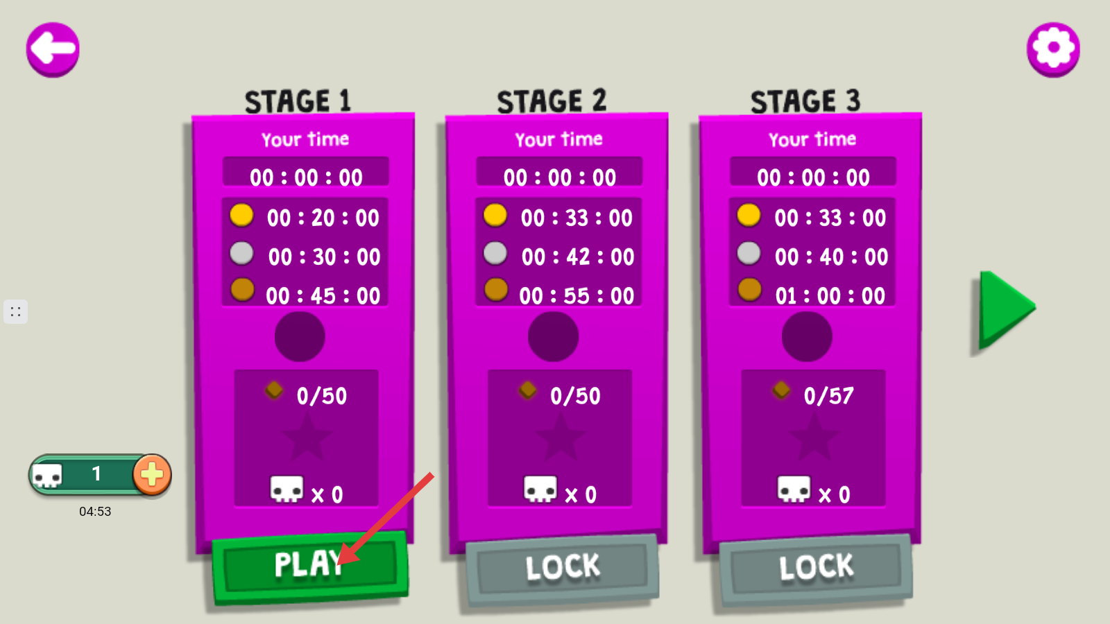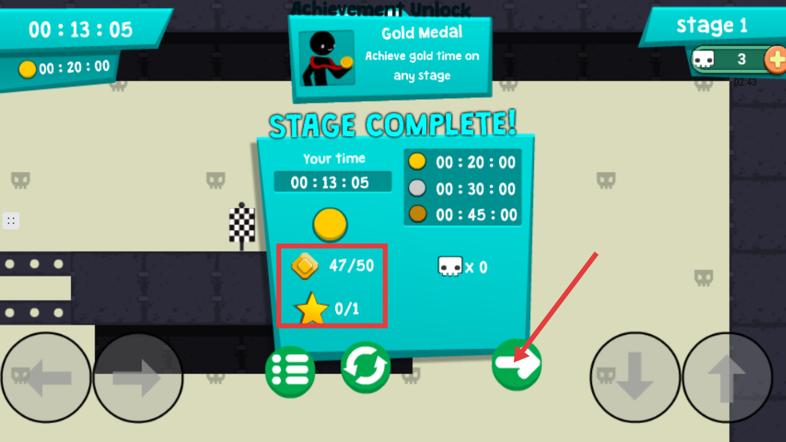4、成功完成【STAGE-1】后,可看到收集的钻石和星星进度,点击绿色箭头按钮,继续后续挑战。