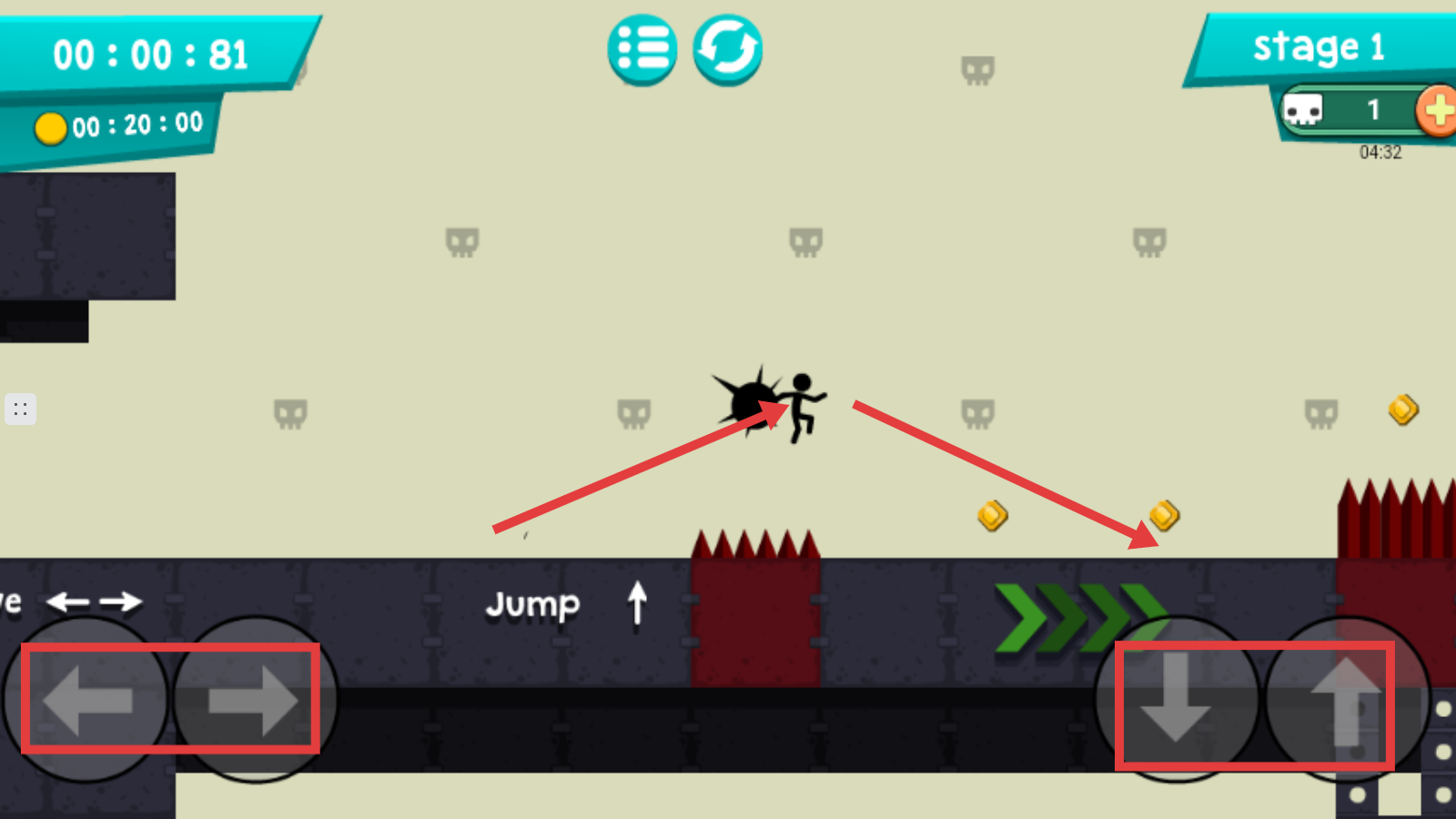 2、在关卡中,通过左右、上下方向键操控火柴人移动,躲避尖刺障碍,同时收集金币。