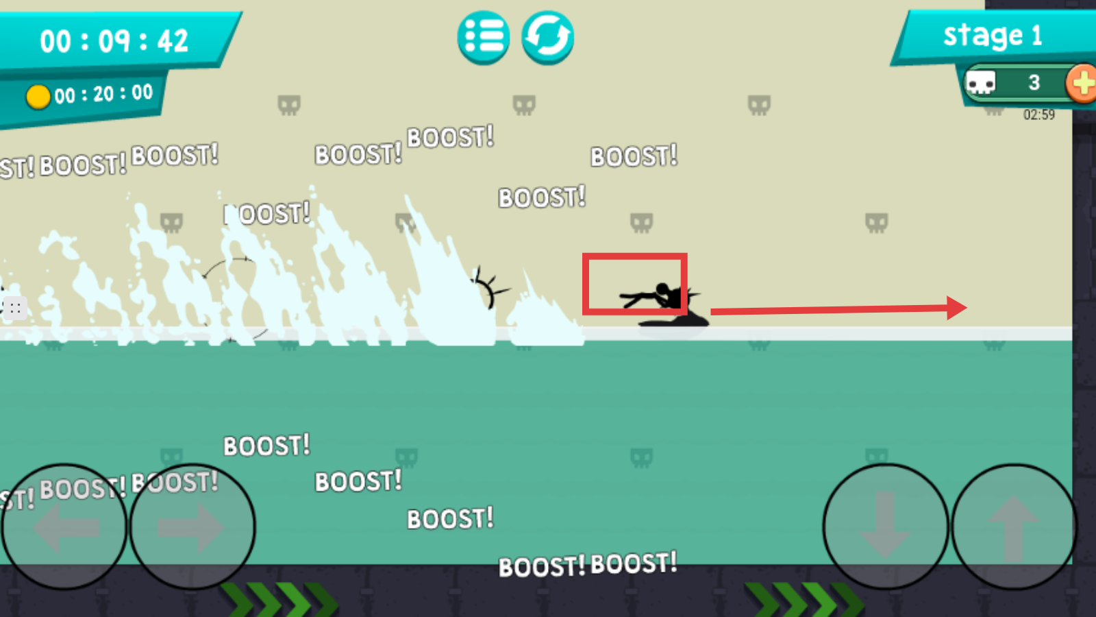 3、挑战里出现【BOOST!】提示时,利用推进效果,让火柴人快速前进,顺利通过水域等区域。