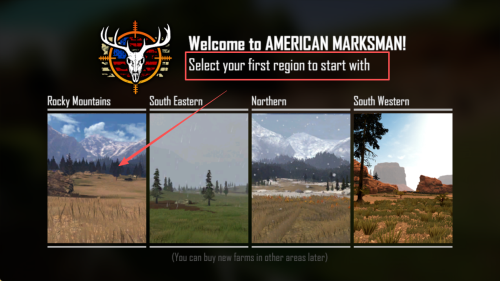 1、如何选择起始地区?在“Welcome to AMERICAN MARKSMAN!”界面点击“Rocky Mountains”或其他区域即可开始,后续可解锁新农场。