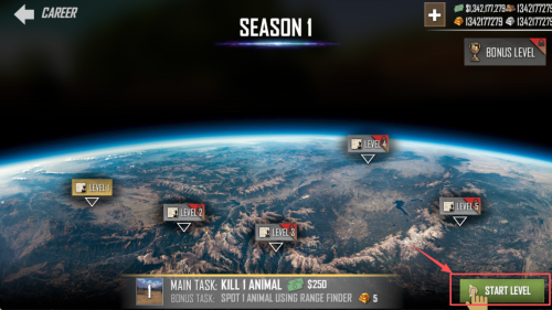 3、如何开始关卡?点击“LEVEL1”查看主线任务“KILL 1 ANIMAL”,再按“START LEVEL”即可进入狩猎场景。