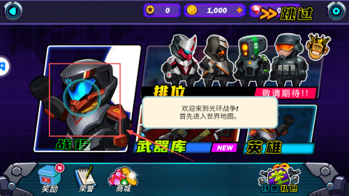 1、如何进入世界地图?在欢迎界面点击“世界地图”按钮,即可进入战役总览,右上角显示1,000金币,也可点“跳过”快速进入。