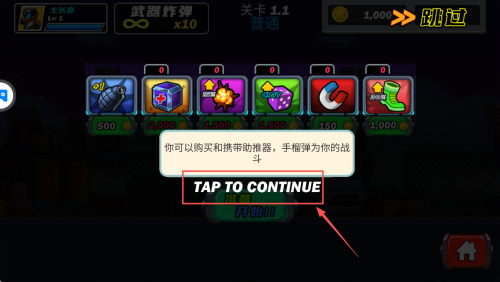 4、如何配置武器与助推器?进入“武器炸弹”界面,用1,000金币购买手榴弹等助推器,点“TAP TO CONTINUE”再按“开始!”即可进入战斗。