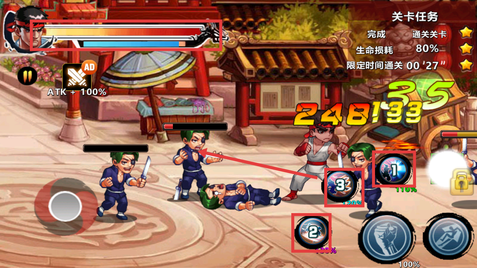 3、战斗中留意上方生命等状态条,当右侧技能图标【1】【2】【3】就绪时,释放技能可更高效打击敌人。