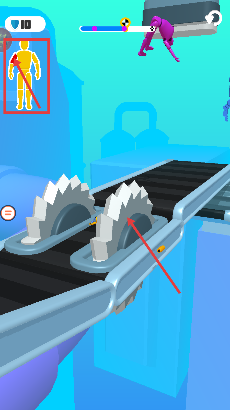 2、在场景移动时,要避开锯片类陷阱,参考左侧黄色人形标识,防止角色受损,保障前进安全。