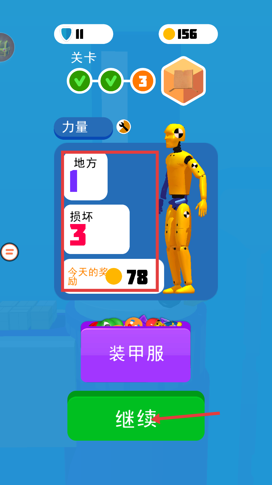 4、通关后会显示【地方-1】【损坏-3】等状态,还能获得【今天的奖励-78】金币,点击【继续】进入后续流程。