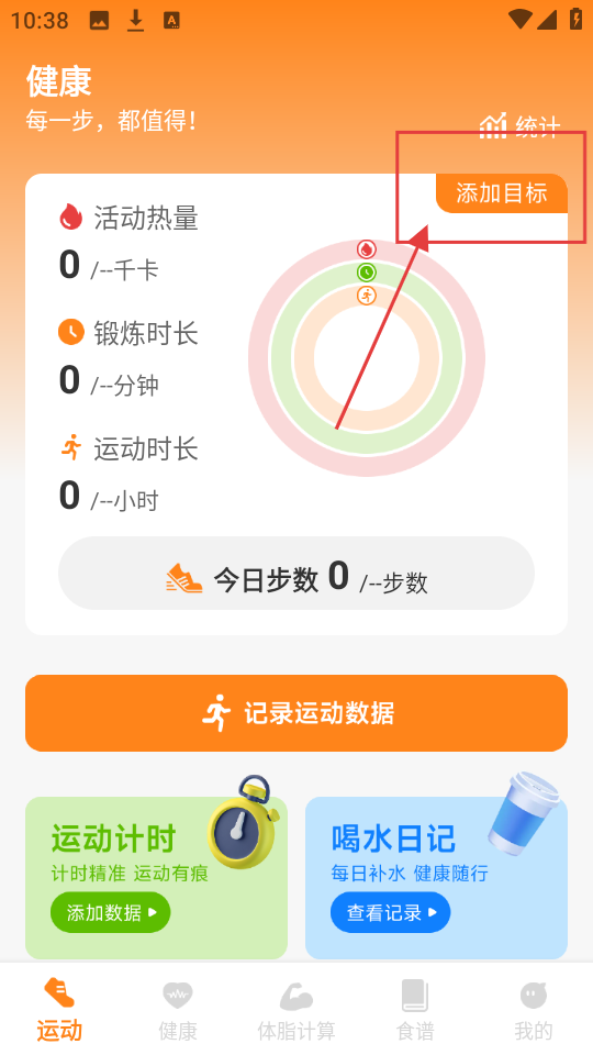 1、在运动页,有活动热量、锻炼时长等数据,点【添加目标】,可设置今日步数、活动热量等目标。