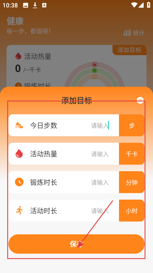 2、在添加目标弹窗,输入今日步数、活动热量等数值,点【保存】,完成目标设置,助力运动规划。