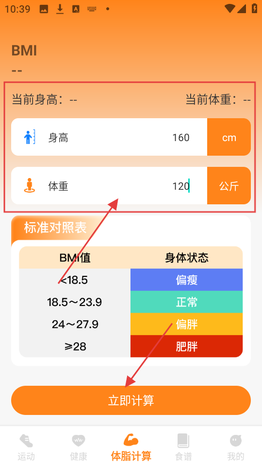 3、到体脂计算页,输入身高、体重数值,点【立即计算】,获取BMI指数等身体状态相关结果。