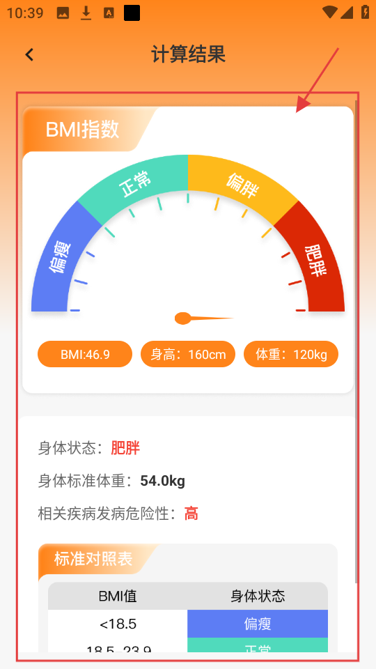 4、查看计算结果,能看到BMI指数、身体状态等,根据结果了解身体情况,为健康管理提供参考。