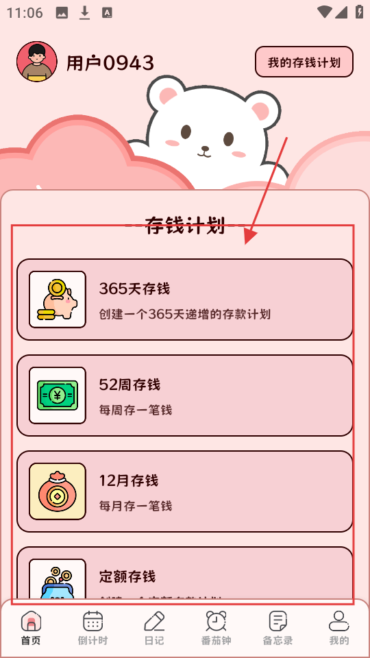 1、在“我的”页面,有【存钱计划】板块,选【365天存钱】,进入365天存钱计划设置页。