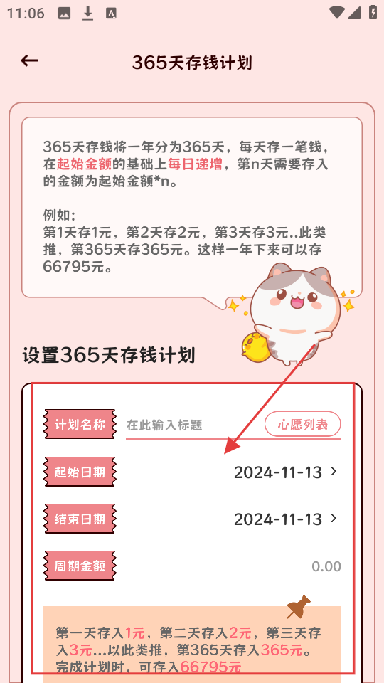 2、在365天存钱计划设置页,输入计划名称、起始日期等,设置周期金额,开启存钱计划。