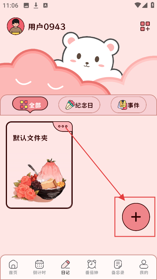 3、在日记页面,有【默认文件夹】等,点右下角“+”号,进入添加笔记本页面。