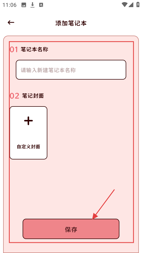 4、在添加笔记本页面,输入笔记本名称,选自定义封面,点【保存】,完成笔记本添加。