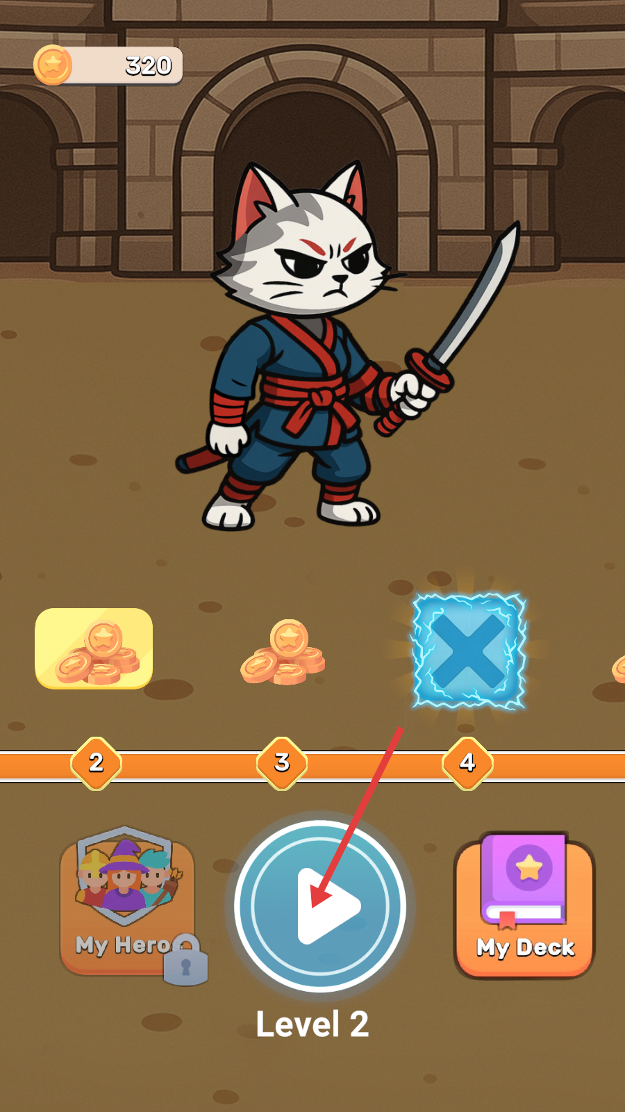 1、进入【Level-2】后,点击中间蓝色播放按钮,操控忍者猫角色开启第二关挑战。