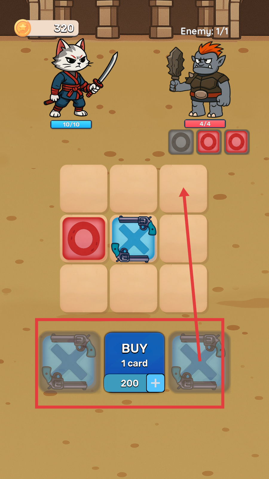 2、战斗时可花费【200】金币点击【BUY-1-card】购买卡牌,将卡牌布置到上方格子中,为攻击敌人做准备。