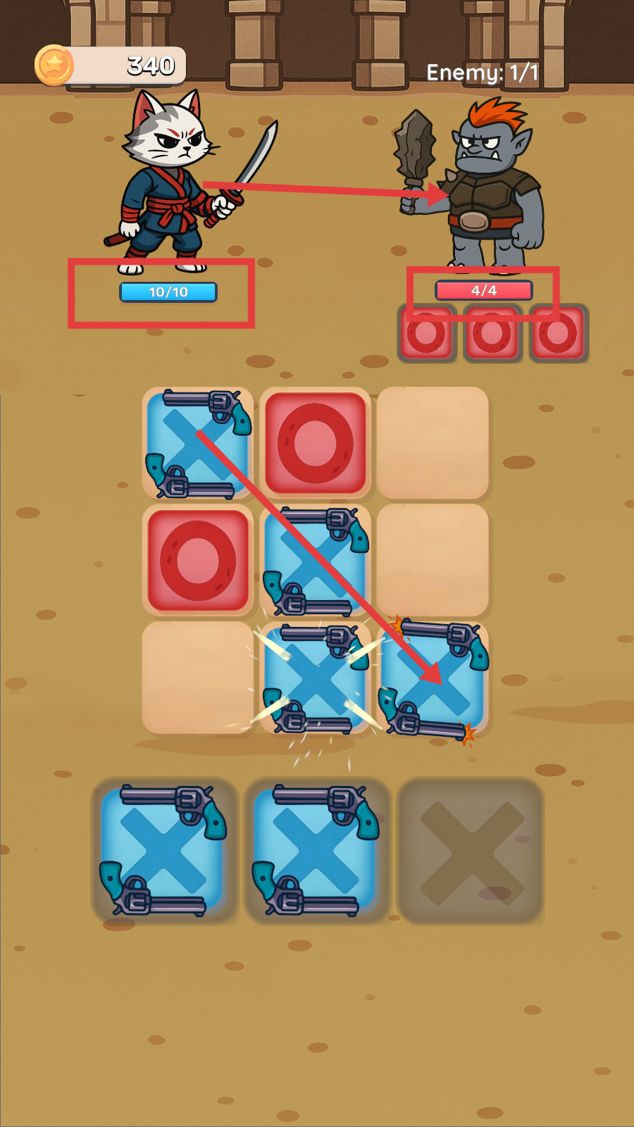3、利用布置好的卡牌攻击敌方角色,留意自身【10/10】与敌方【4/4】的血量条,持续打击直至敌方血量耗尽。
