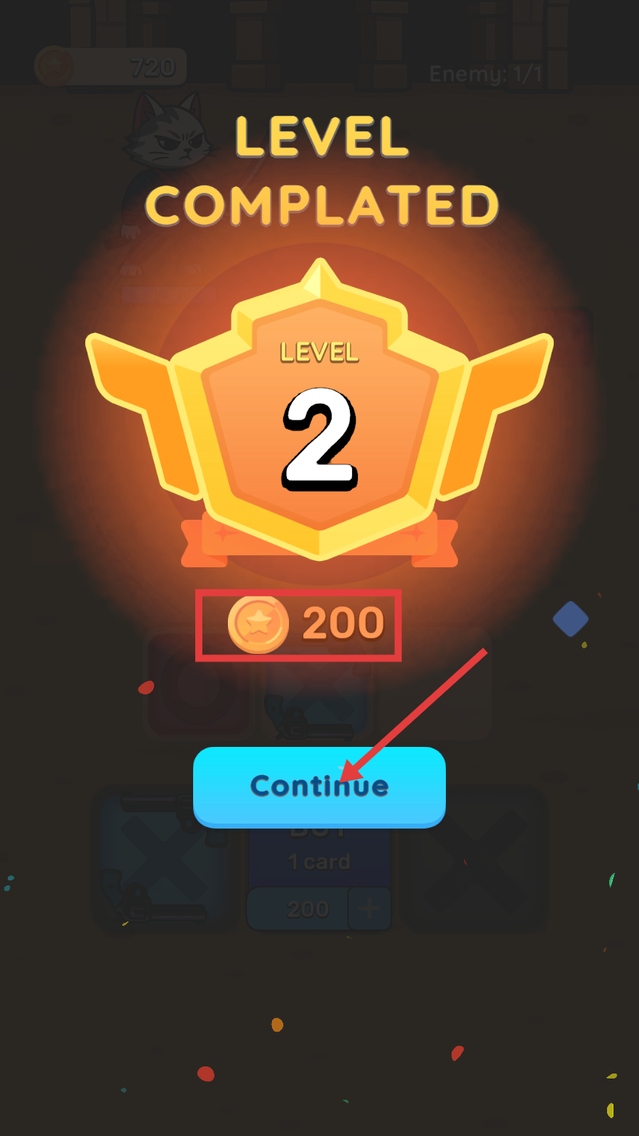4、成功通关【Level-2】后,会获得【200】金币奖励,点击【Continue】按钮可继续挑战后续关卡。