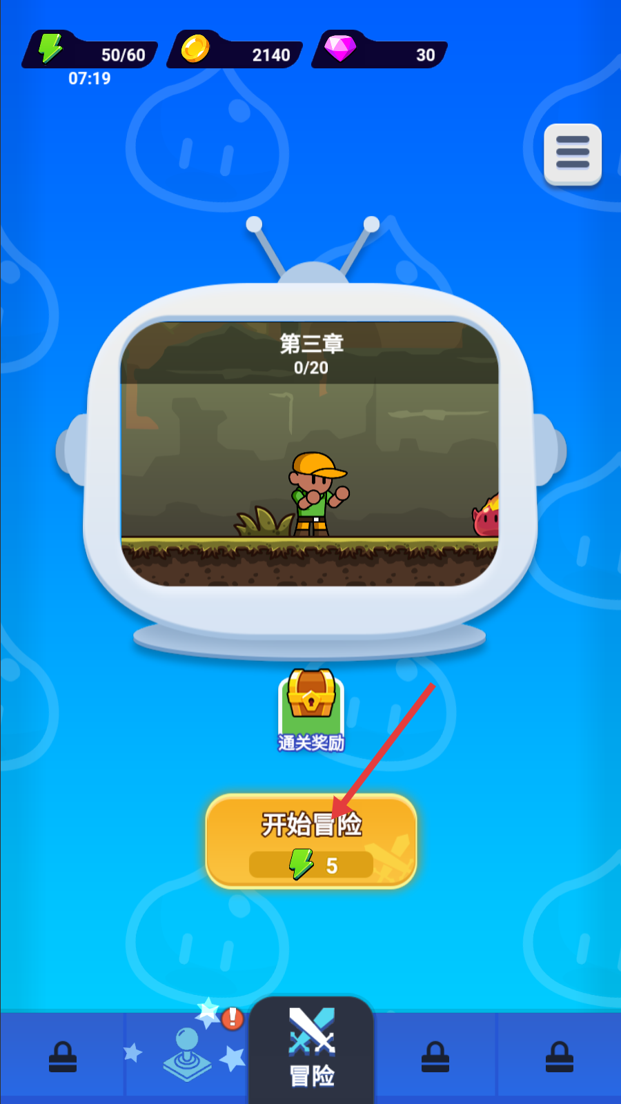 1、点击【开始冒险】按钮,消耗【5】点能量,进入【第三章-0/20】的冒险挑战。