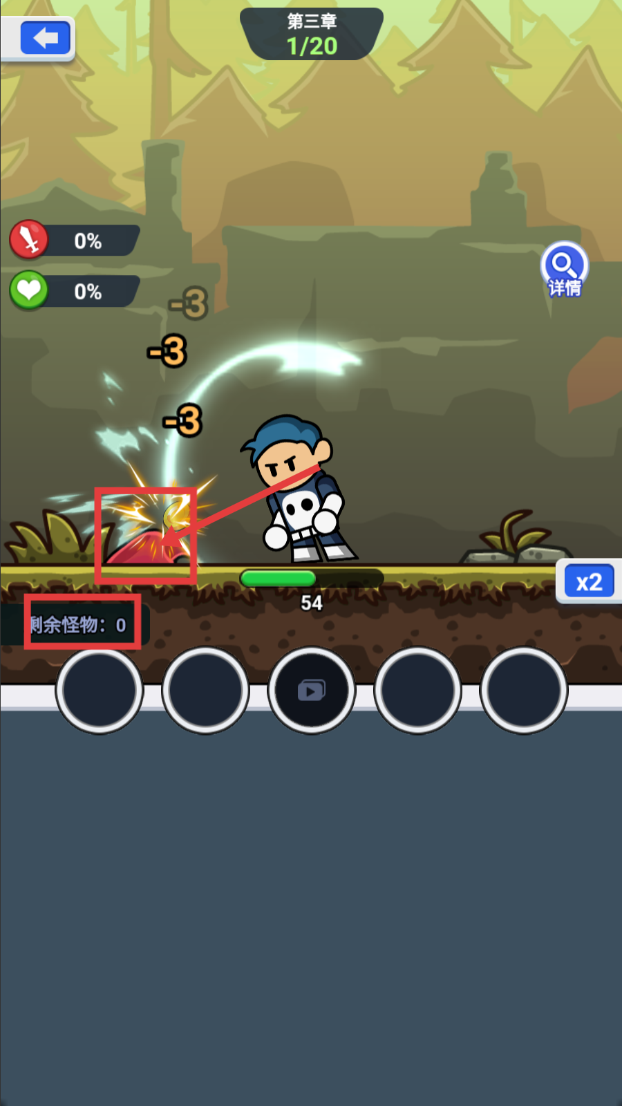 2、战斗时全力攻击场景内的怪物,将【剩余怪物-0】全部击败,推进【第三章】的进度。