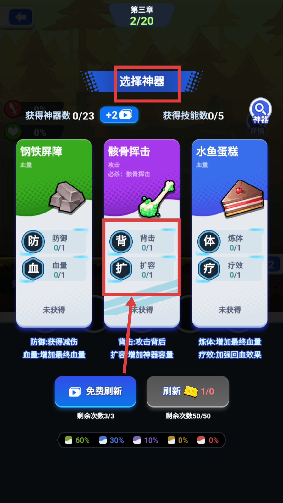 3、通关后在【选择神器】界面,可挑选【骸骨挥击】神器,获取【背-攻击背后】【扩-增加神器容量】等能力。