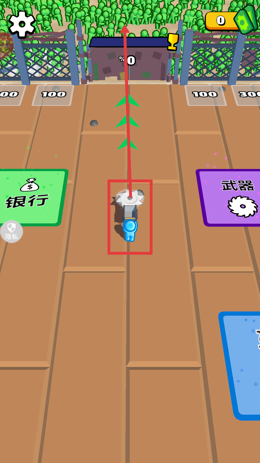 1、操控蓝色角色带着武器前进,朝着绿色人群方向移动,准备开展战斗或收集操作。