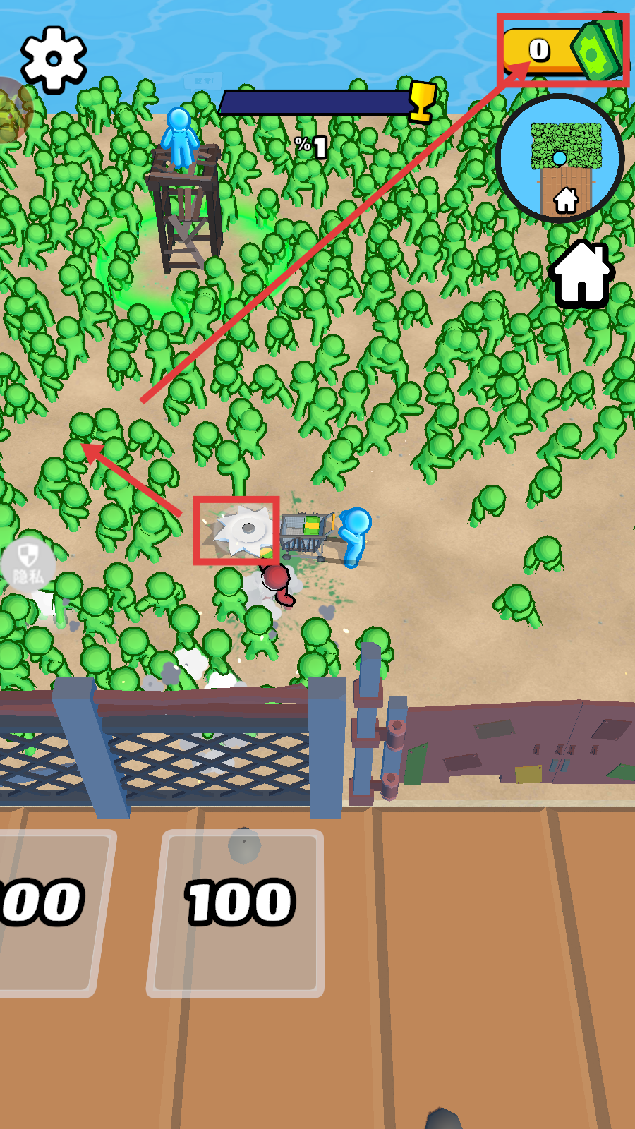 2、使用武器攻击绿色人群,通过打击积累资源,留意右上角的货币数值变化,收集更多货币。