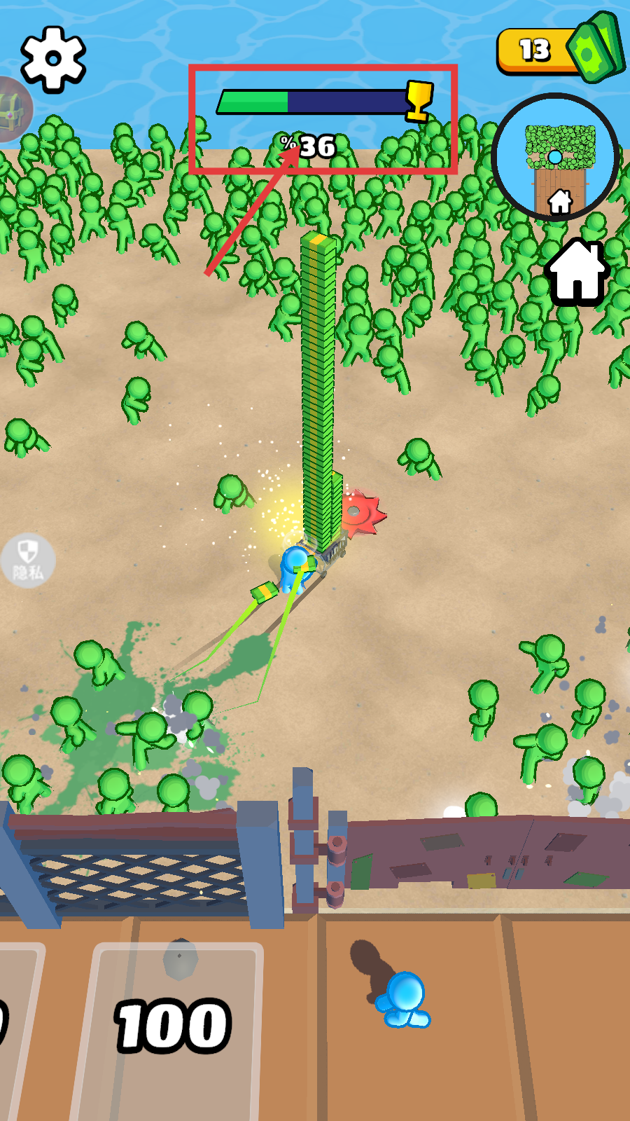 4、持续攻击绿色人群,观察上方进度条,当进度达到【%36】时,说明关卡推进效果良好,继续保持攻击节奏。