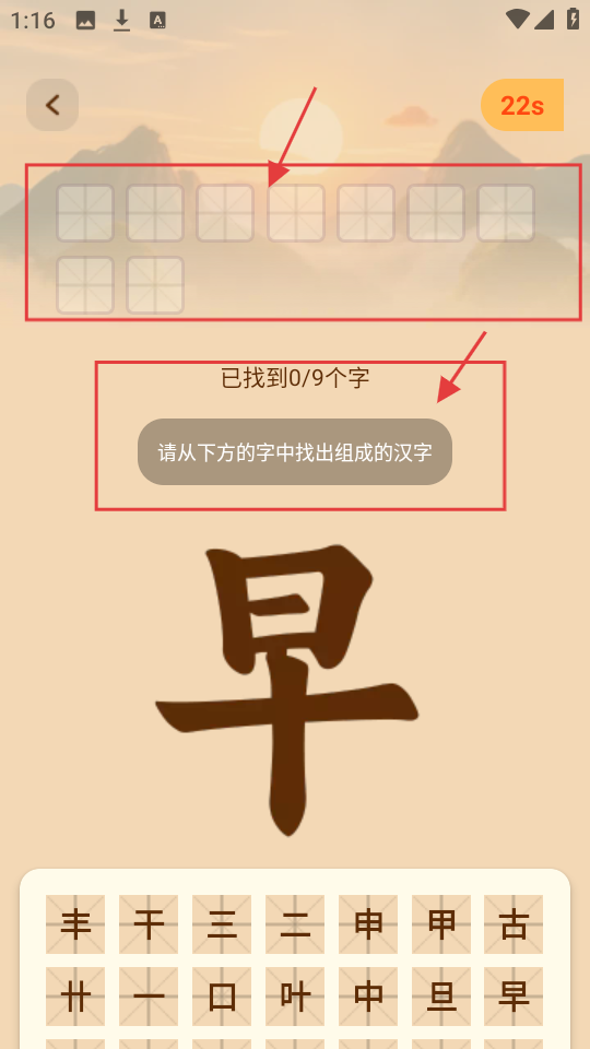 2、在拆字挑战页,需从下方字中找组成的汉字,界面显示已找到字数,限时内完成找字任务。