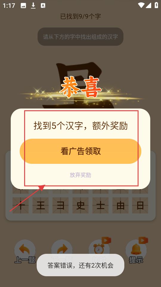 3、成功找到9/9个字后,弹出奖励弹窗,找到5个汉字有额外奖励,可点【看广告领取】获取。