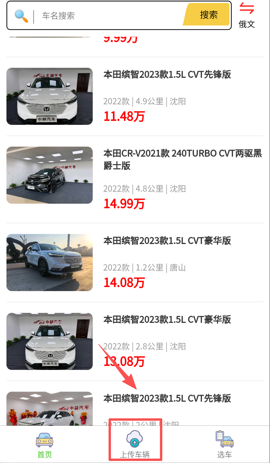 2、 添加新车源时点击"添加车辆",填写VIN码自动获取基础信息,补充俄语版车辆描述与参数,上传360度环视照片后提交平台审核。