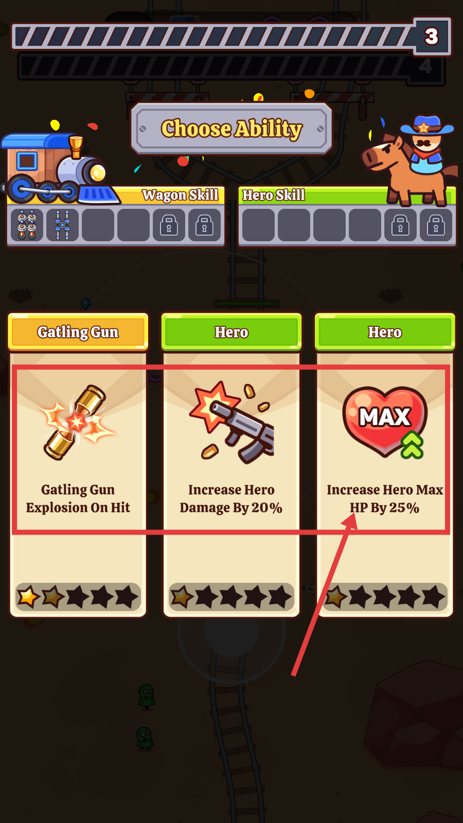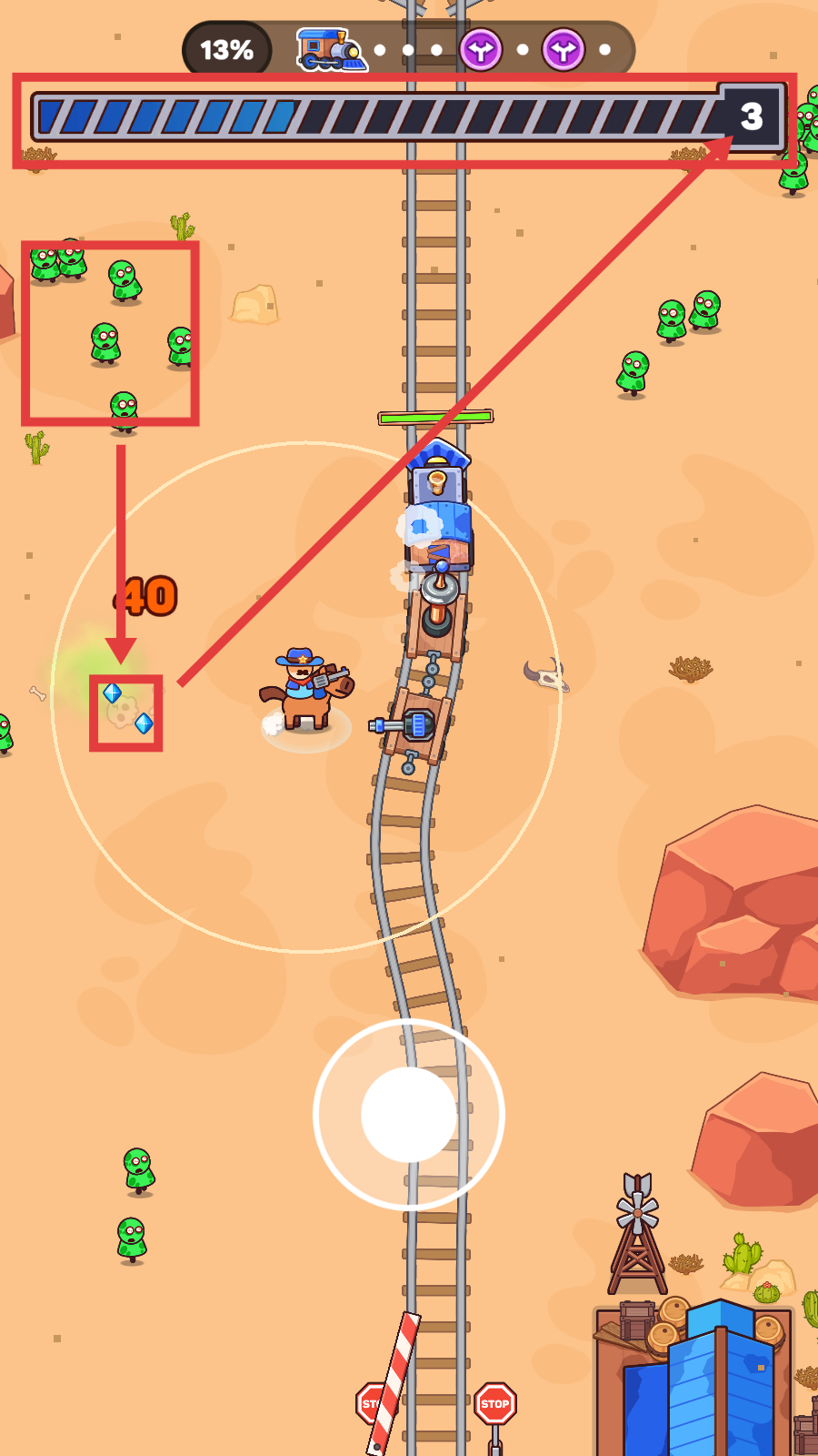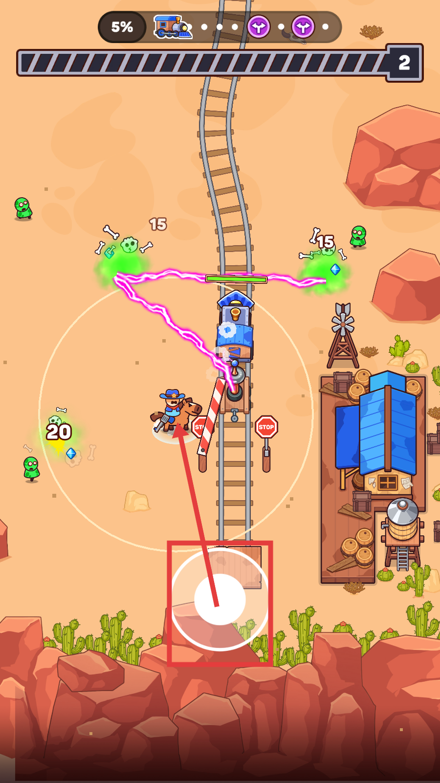 1、操控牛仔角色,借助火车或自身攻击,清理周围绿色小怪,把握攻击节奏,推进游戏进度。