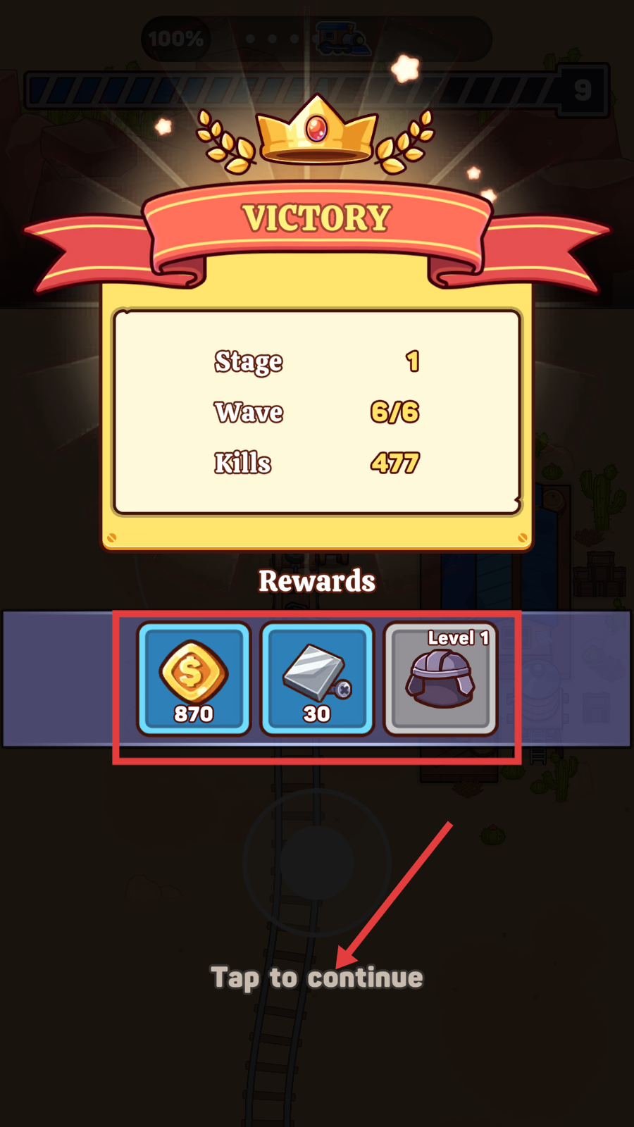 4、通关后会显示“VICTORY”,获得金币、材料及【Level1】头盔等奖励,点击【Taptocontinue】可继续游戏。