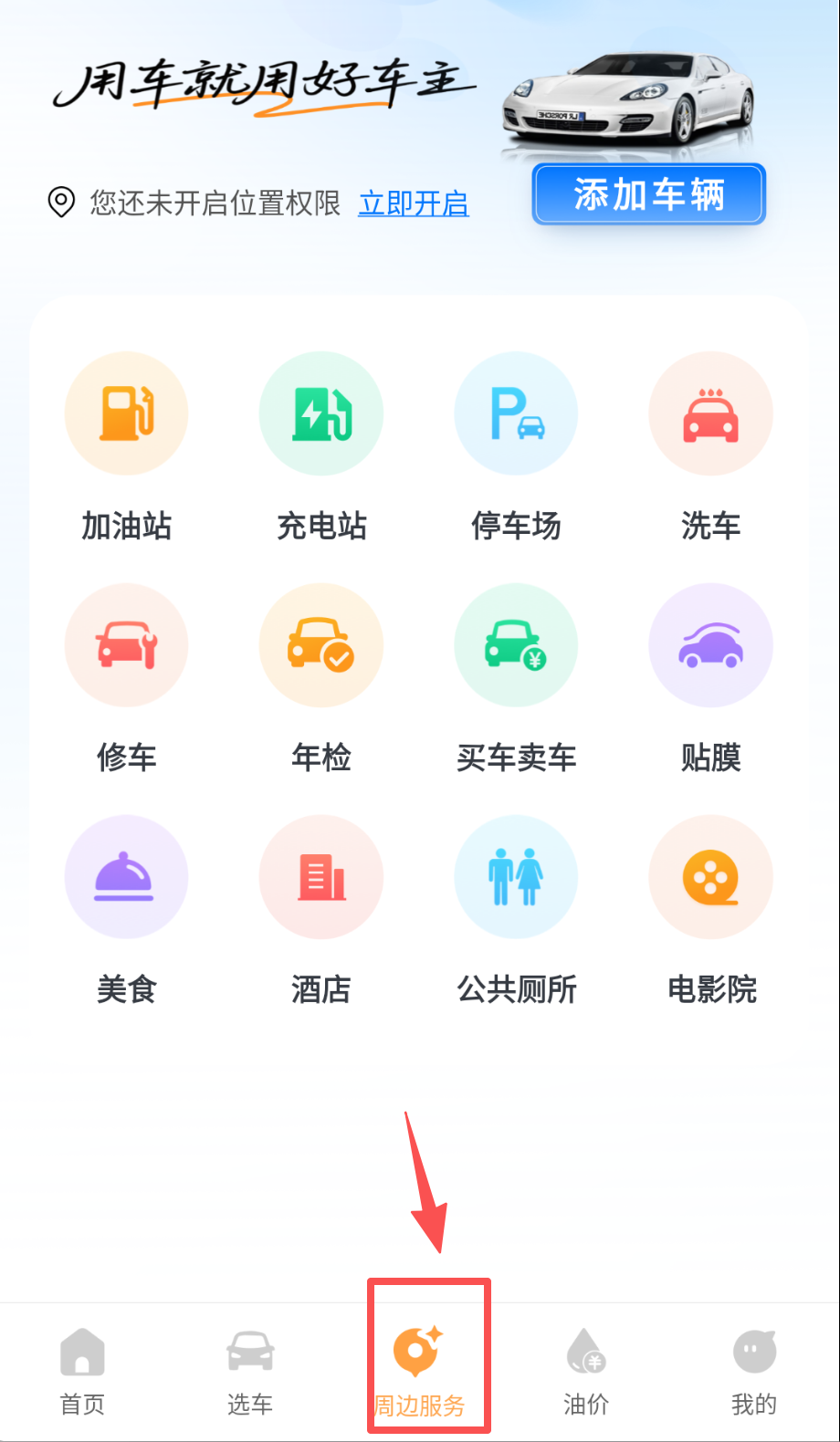 1、 打开APP后进入服务发现页,系统自动定位展示周边加油站、充电桩及汽修门店信息,点击对应图标可查看详情、距离和用户评价。