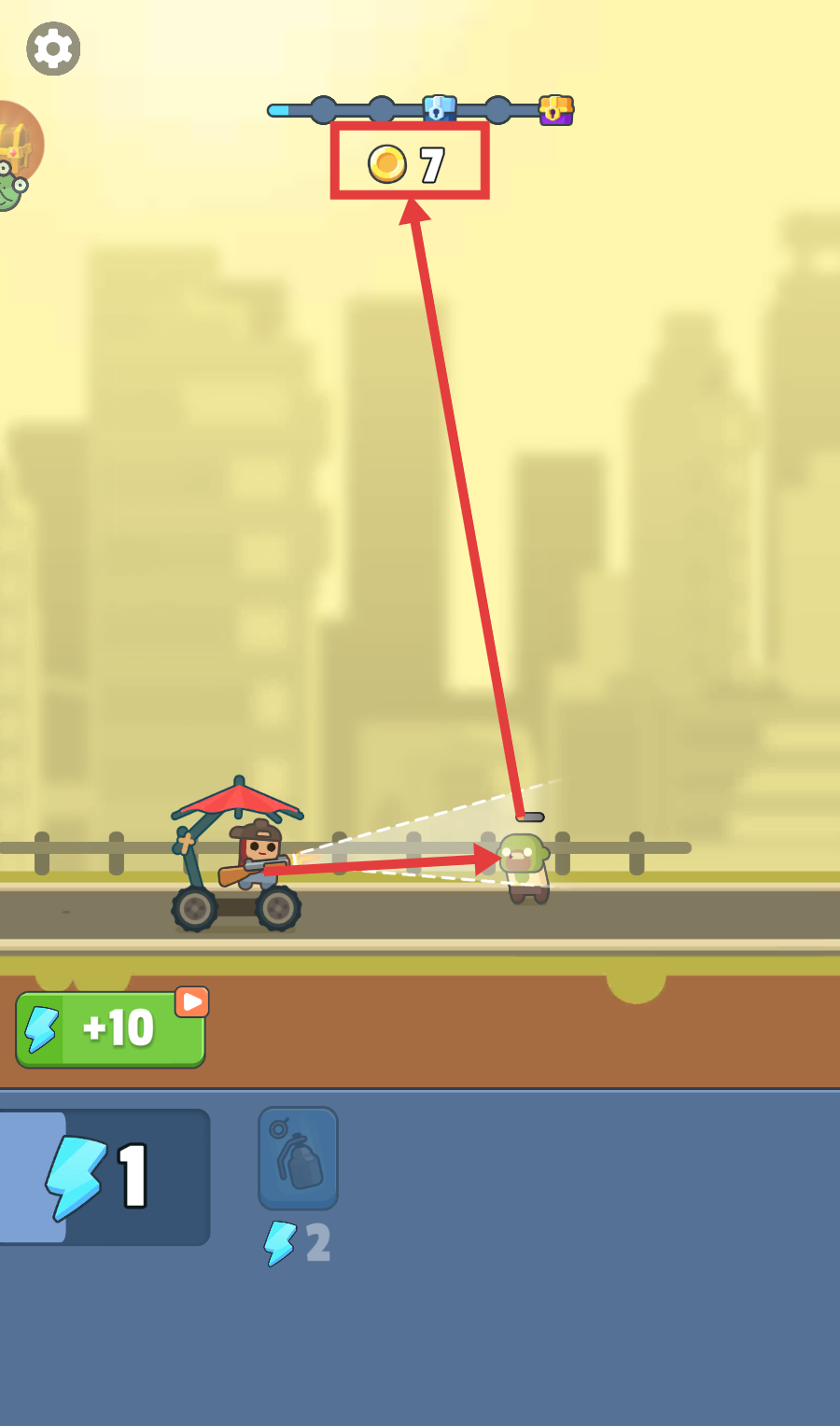 2、战斗中操控角色攻击前方绿色小怪,成功击败可获得金币,能积累到【7】枚,逐步收集资源。