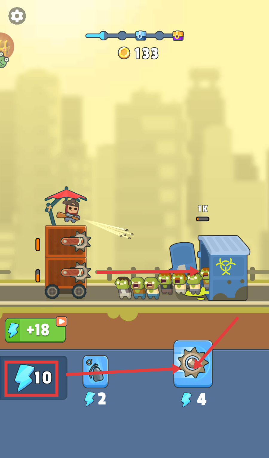 3、面对大量僵尸时,消耗【10】点能量,使用齿轮类道具辅助攻击,可高效清理僵尸群并继续集币。