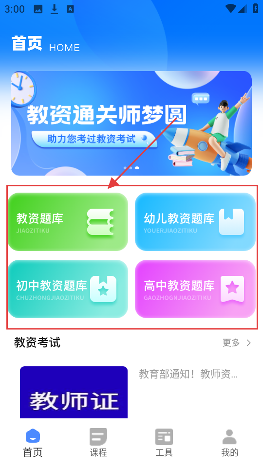 1、在首页,有【教资题库】【幼儿教资题库】等,选对应教资题库,进入教师资格证练习页。