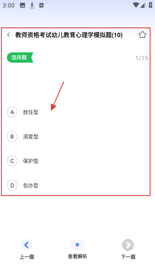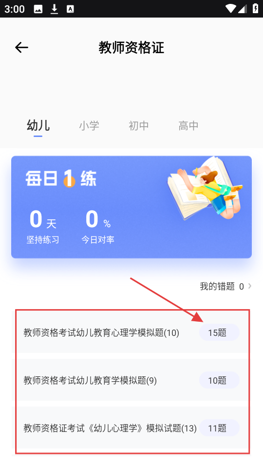 2、在教师资格证练习页,选幼儿类别,有每日1练和多套模拟题,选一套模拟题,开始做题。