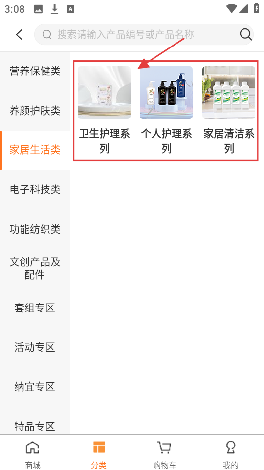 1、在分类页,有营养保健类、养颜护肤类等分类,选【养颜护肤类】,进入对应品类页。