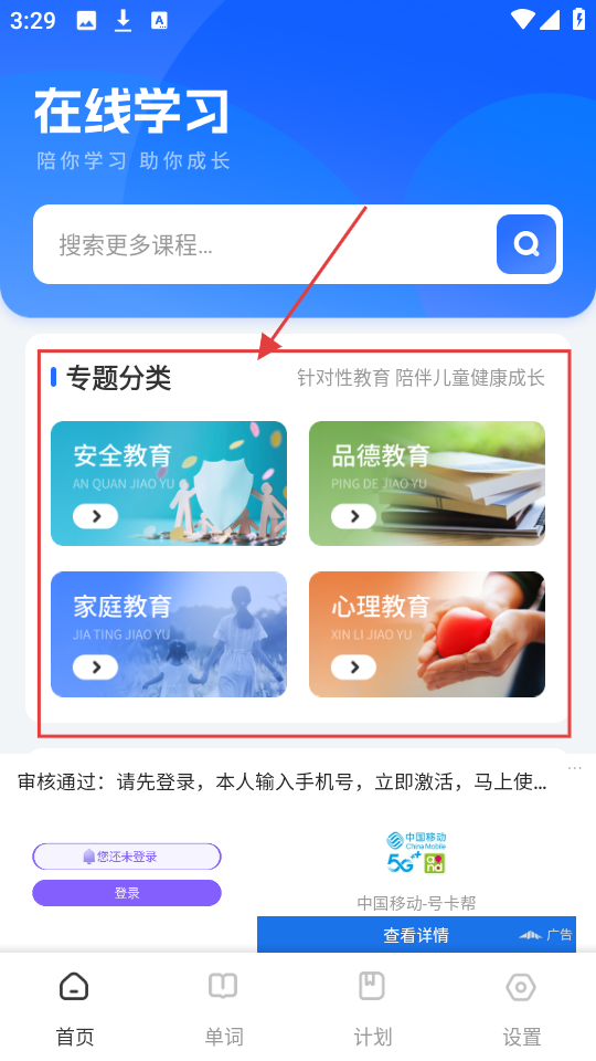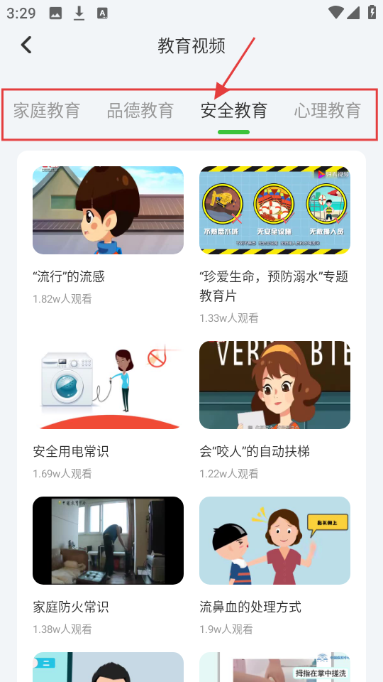 1、进入在线学习首页,有安全教育、品德教育等专题分类,选【安全教育】,进入教育视频页。
