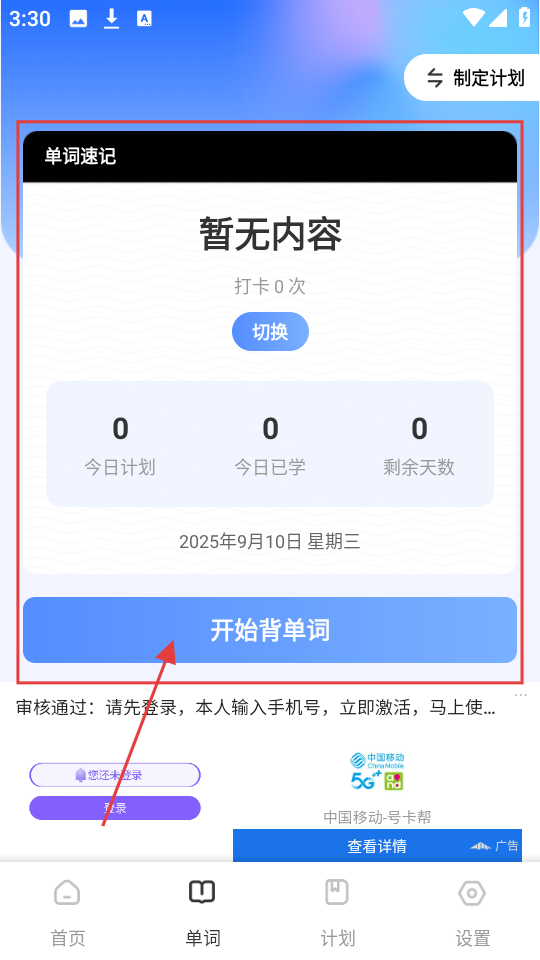 4、到单词页,点【开始背单词】,可进行单词学习,提升词汇量。