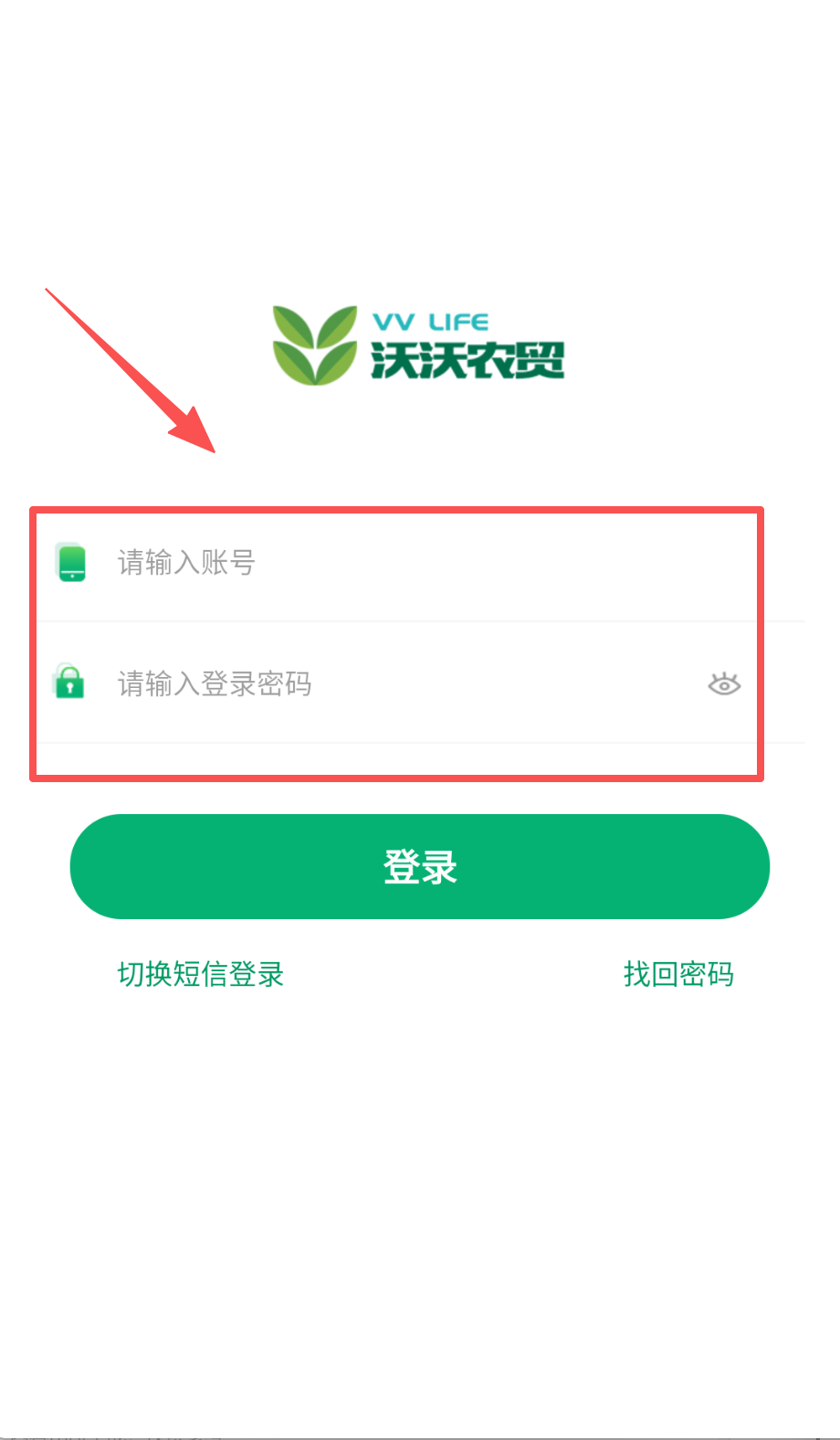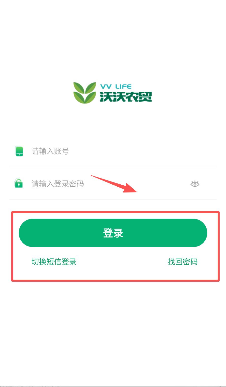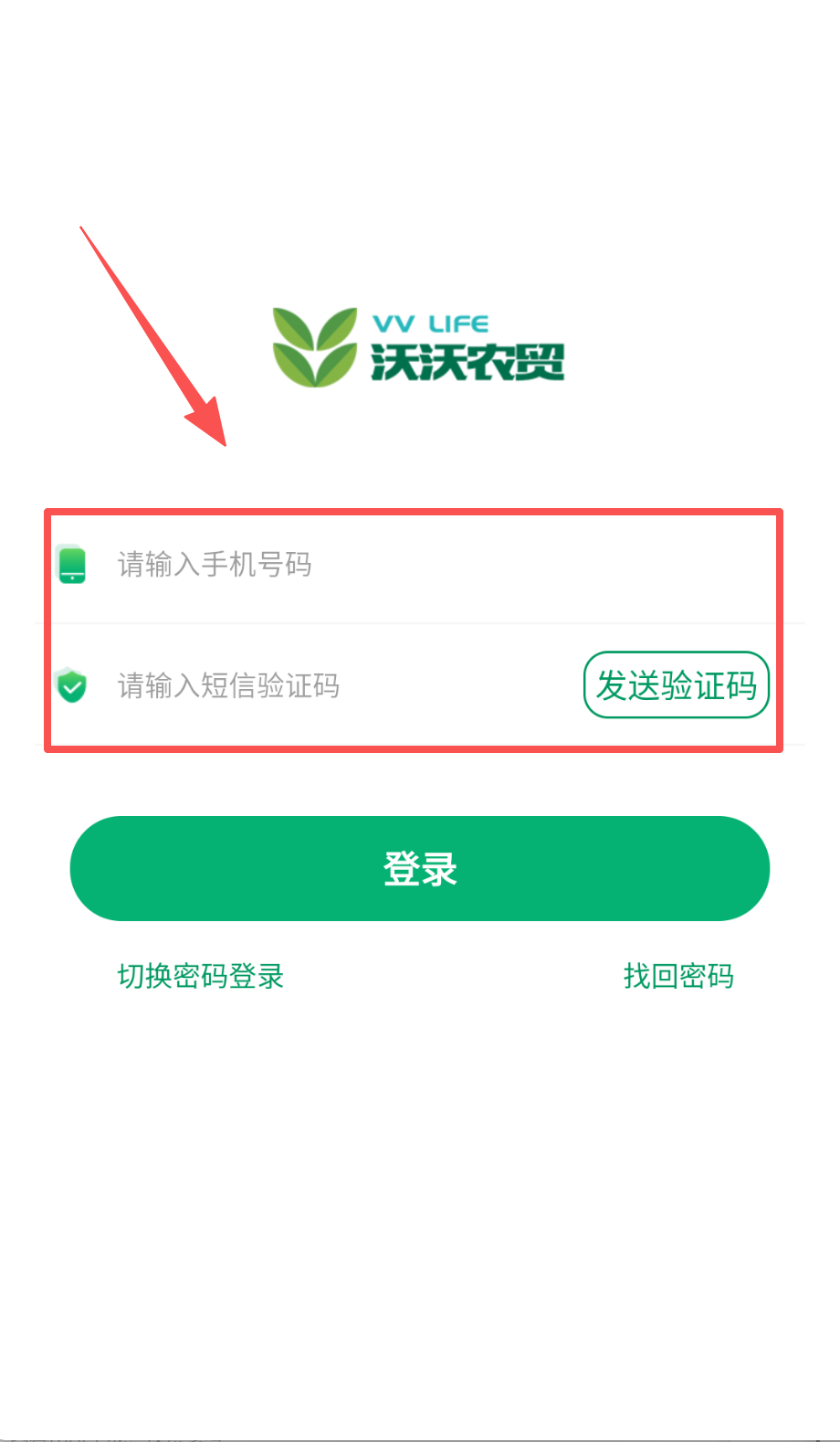 1、 打开沃沃农贸APP,你会看到清爽的登录界面哦。想用短信登录就输入注册手机号,再点旁边的“发送验证码”,忘记密码也能在这里找回。