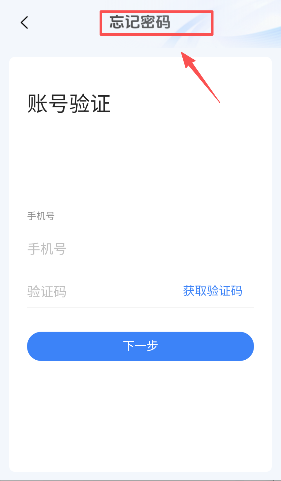 4、 忘记密码别担心,在登录界面点“忘记密码?”链接,进入账号验证页面后输入两次你的手机号确保无误,点击“获取验证码”按钮。