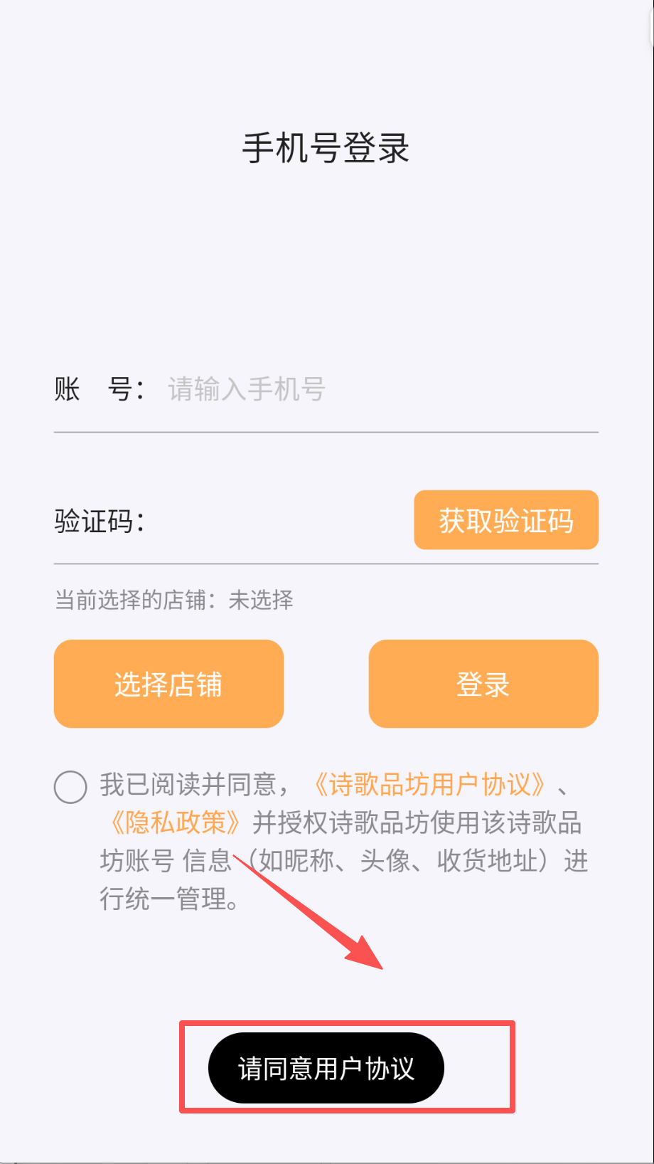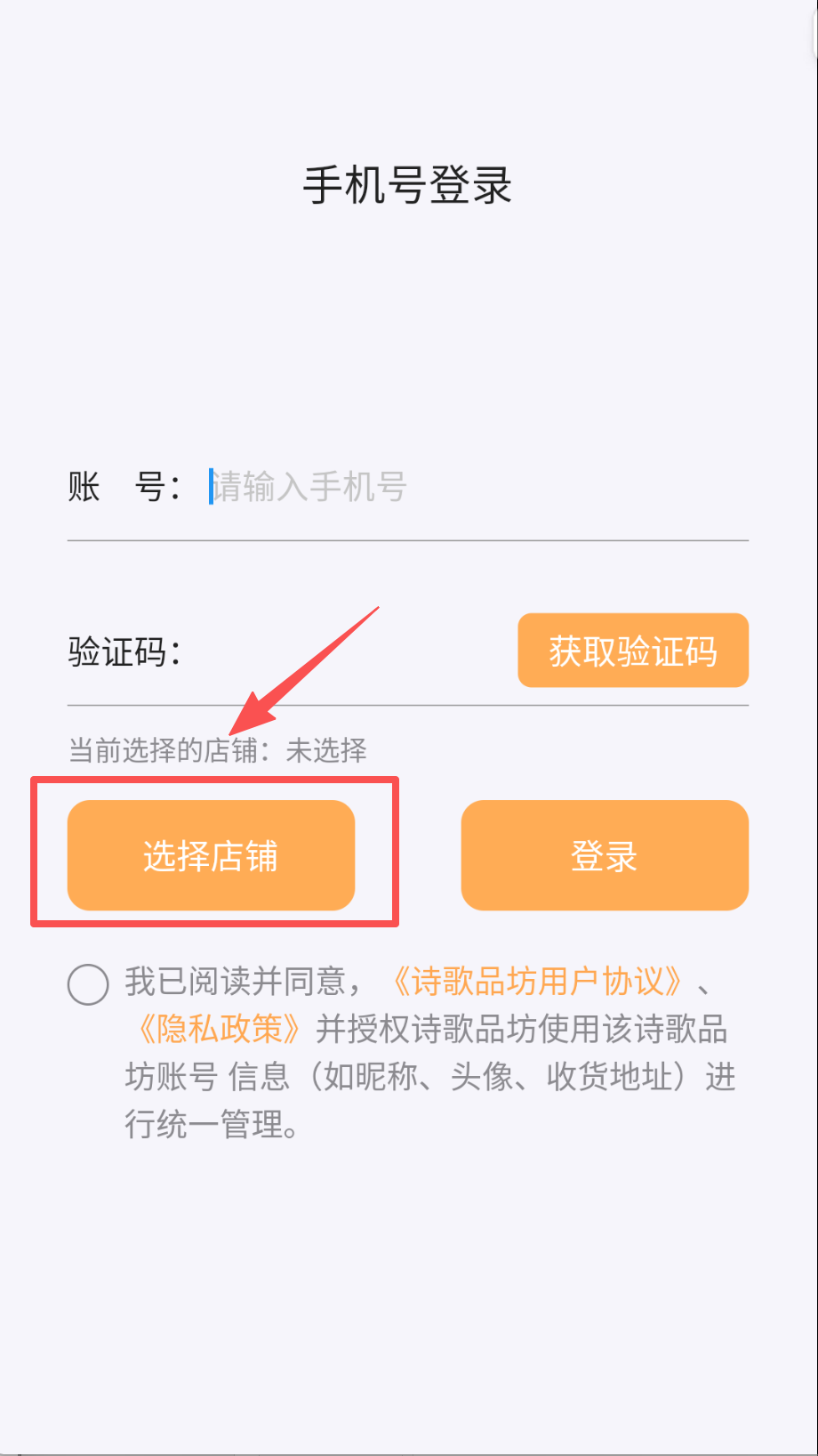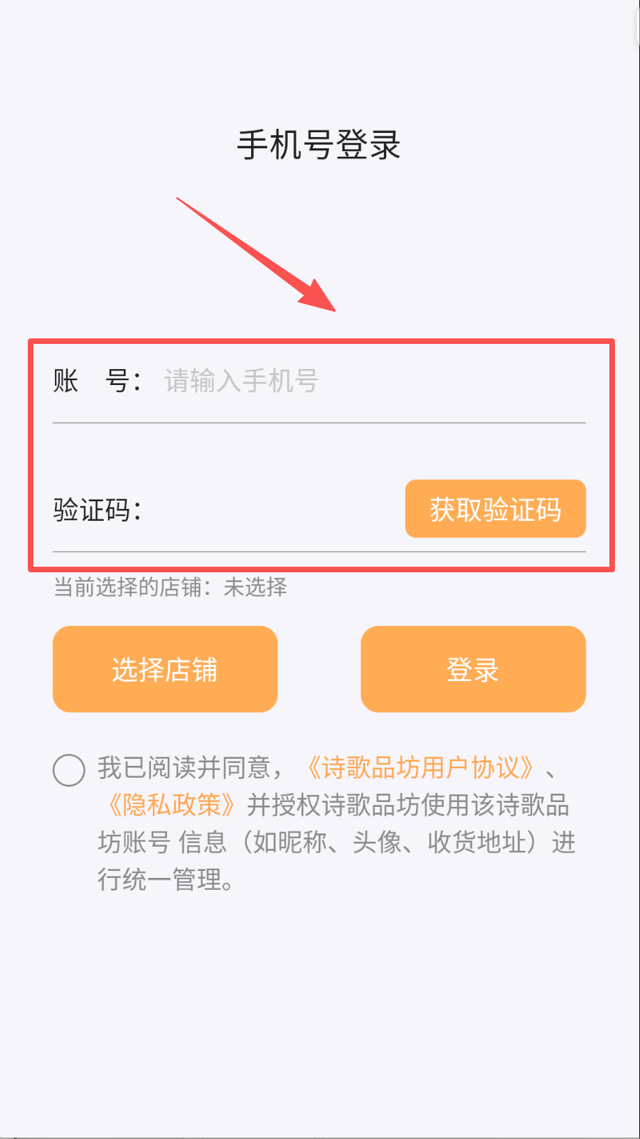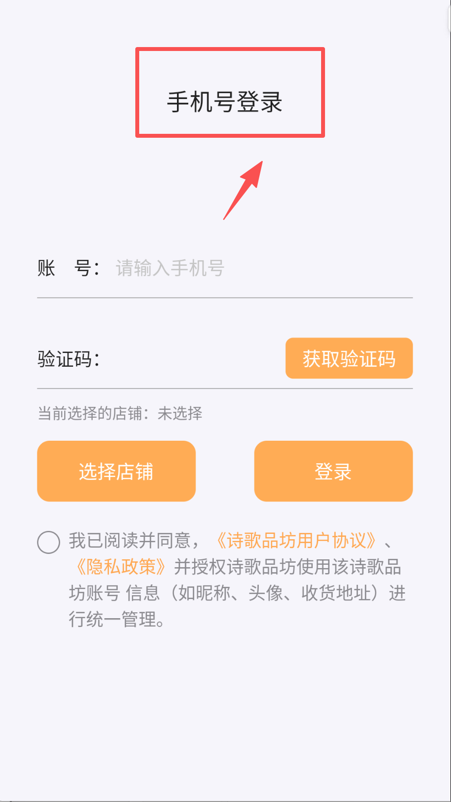 1、 打开诗歌品坊商家APP呀,首先会看到登录界面,页面上方写着“手机号登录”,下面有“账号”输入框(提示请输入手机号)和“验证码”输入框。