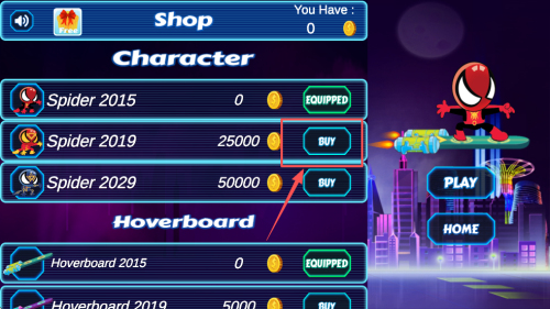1、开启滑板冒险:进入游戏熟悉规则,了解 “控滑板、集金币、冲积分” 的目标,选择初始关卡,开启蜘蛛侠的滑板挑战。