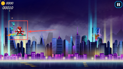 2、操控滑板闯关:通过简单操作(如左右滑动、跳跃)控制蜘蛛侠躲避赛道障碍,保持滑板平稳前进,避免闯关失败。