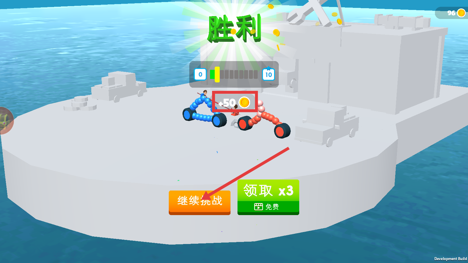 4、击败对手后,界面显示【胜利】并获得+50金币,点击橙色【继续挑战】按钮,开启下一场对战。