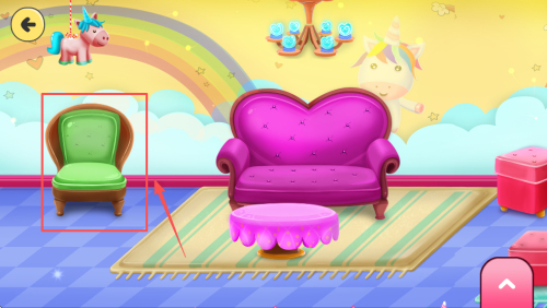 2、布置专属房间:选择独角兽厨房、餐厅或客厅,挑选装饰道具(如餐具、家具)自由摆放,打造专属风格房间。