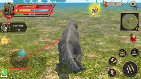 1、进入游戏后,通过左侧摇杆操控恐龙移动,同时留意上方生命值、体力等属性值,保持状态探索场景。