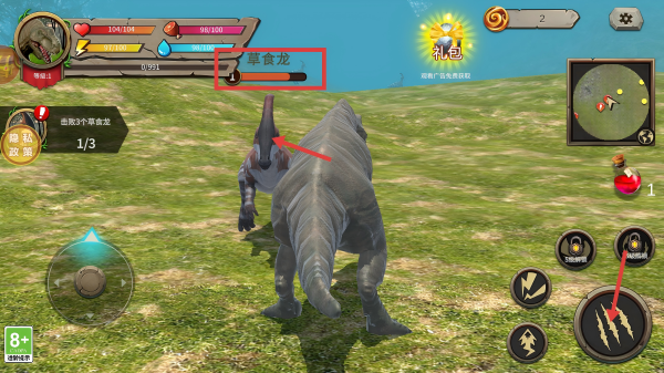 2、遇到【草食龙】时,点击右侧爪击类攻击按钮,对其发起攻击,逐步削减草食龙的血量。